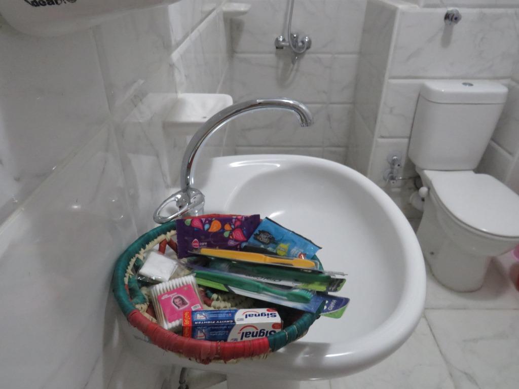 Im Bad erhalten die Gäste ein vollständiges Set an Badutensilien (Zahnbürsten, Zahnpasta, Duschhaube, Wattestäbchen, Feuchttücher, Shampoo, Haarspülung, Seife usw.) sowie Pareo-Handtücher.
